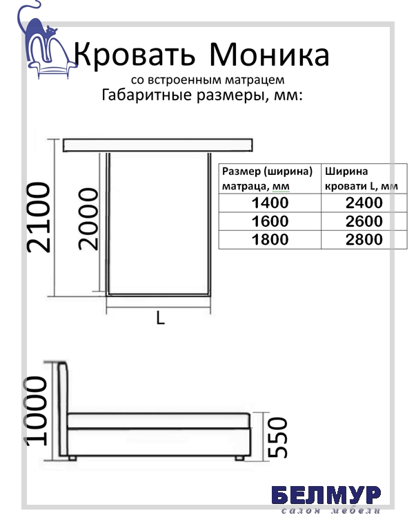 | Ширина, см | +100 см к ширине матраца |