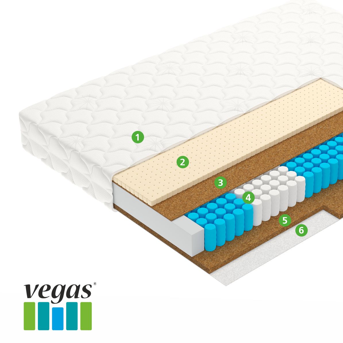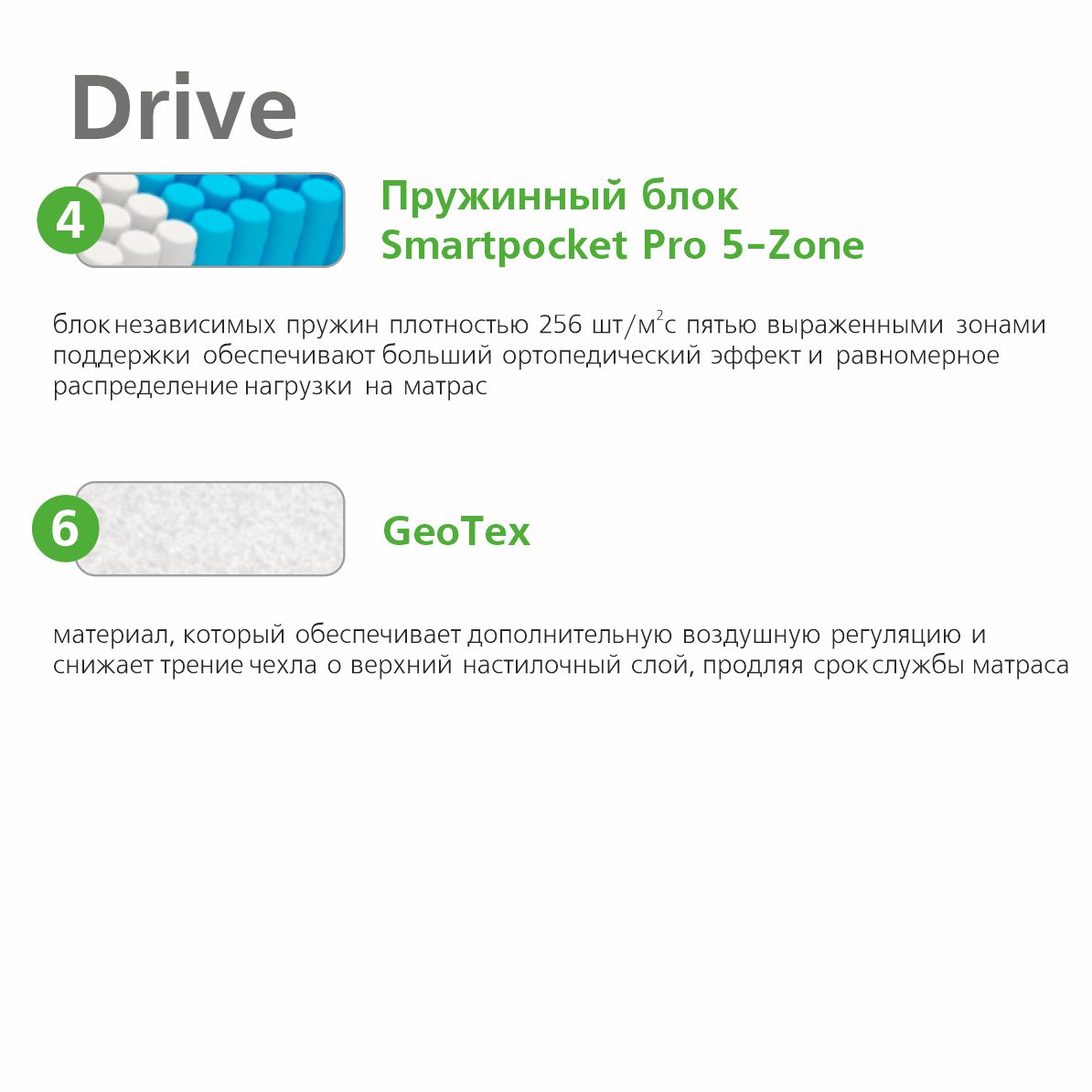 6 - GeoTex - Материал, состоящий из спрессованных волокон. Применяется для дополнительной воздушной регуляции, а также снижения трения чехла о верхний настилочный слой, продляя срок службы матраса.