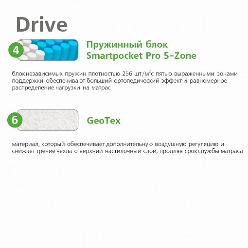 5- Пружинный блок Smartpocket Pro 5-Zone - Блок независимых пружин плотностью 256 шт/м2. Пять выраженных зон поддержки обеспечивают больший ортопедический эффект, равномерное распределение нагрузки на матрас и дарят комфорт во время сна.