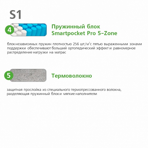 4- Пружинный блок Smartpocket Pro 5-Zone - Блок независимых пружин плотностью 256 шт/м2. Пять выраженных зон поддержки обеспечивают больший ортопедический эффект, равномерное распределение нагрузки на матрас и дарят комфорт во время сна.