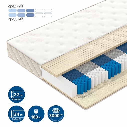 | Базовый блок матраса | Независимый пружинный блок TFK X3000, 1500 пружин на 1м.кв., 7 зон комфорта |