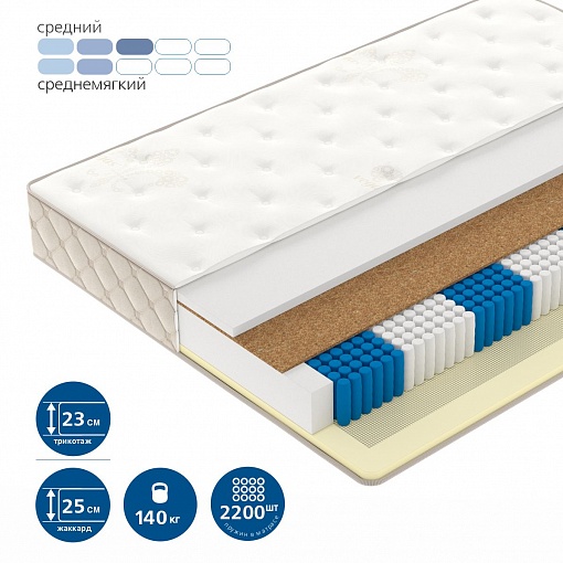 | Базовый блок матраса | Независимый пружинный блок TFK R2200, 1100 пружин на 1м.кв., 7 зон комфорта |