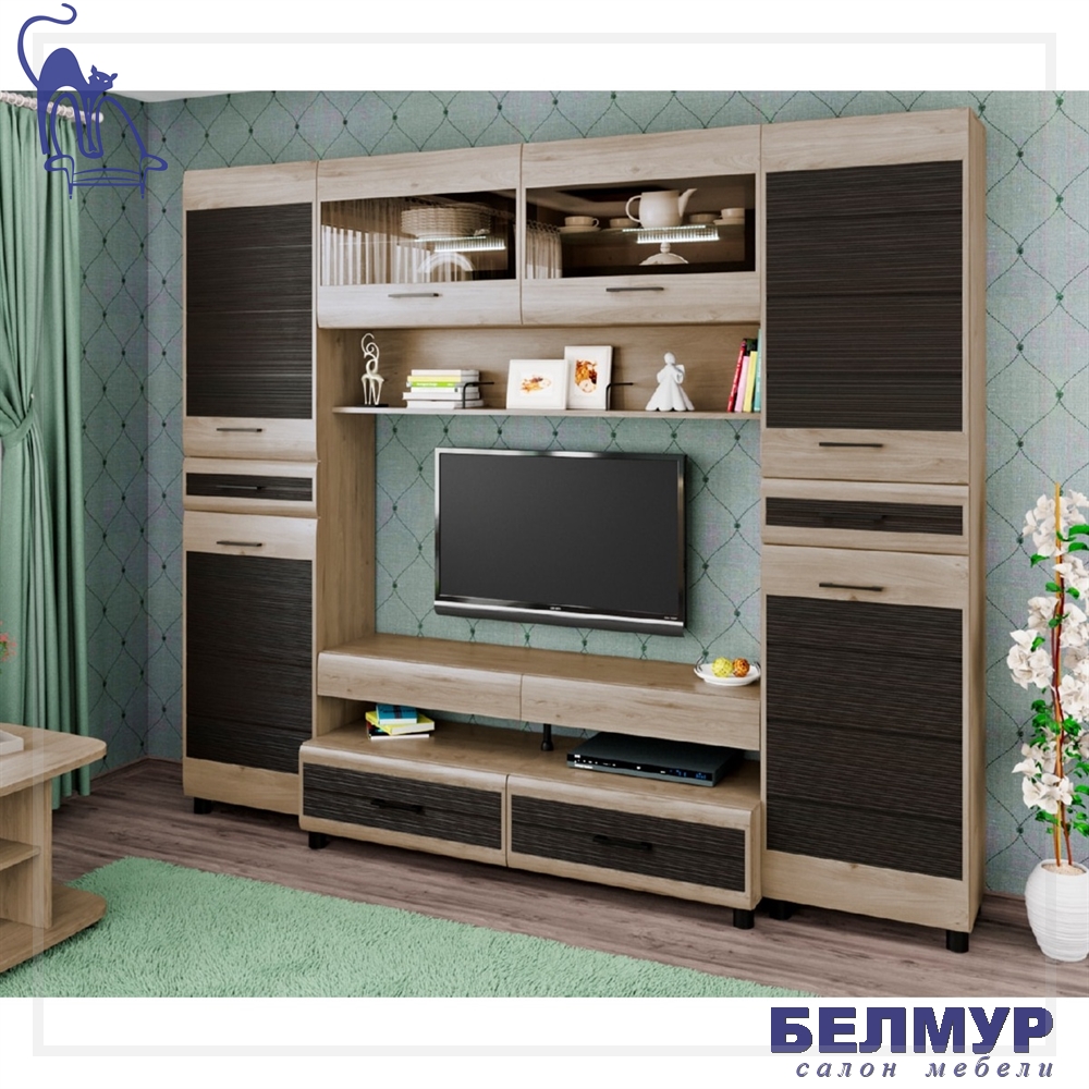 - В гостиной "Глейс" необычная открытая полка является как будто продолжением ручки - декора. Она имеет вид визуально объемного, толстостенного, цельнодеревянного бруса и при этом она необычайно легкая. Поэтому элементы мебели из тамбурата на всем протяжении срока эксплуатации мебель сохраняет идеальную форму и стильный вид.