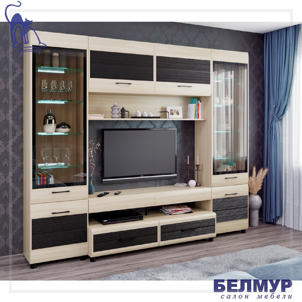 - В гостиной "Глейс" необычная открытая полка является как будто продолжением ручки - декора. Она имеет вид визуально объемного, толстостенного, цельнодеревянного бруса и при этом она необычайно легкая. Поэтому элементы мебели из тамбурата на всем протяжении срока эксплуатации мебель сохраняет идеальную форму и стильный вид.