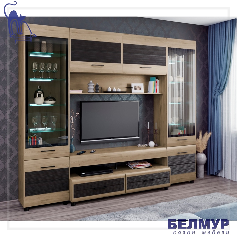 - В гостиной "Глейс" необычная открытая полка является как будто продолжением ручки - декора. Она имеет вид визуально объемного, толстостенного, цельнодеревянного бруса и при этом она необычайно легкая. Поэтому элементы мебели из тамбурата на всем протяжении срока эксплуатации мебель сохраняет идеальную форму и стильный вид.