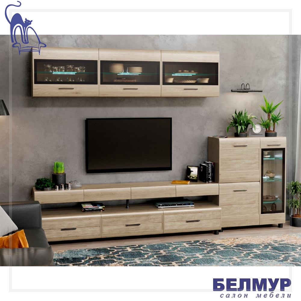 - В гостиной "Глейс" необычная открытая полка является как будто продолжением ручки - декора. Она имеет вид визуально объемного, толстостенного, цельнодеревянного бруса и при этом она необычайно легкая. Поэтому элементы мебели из тамбурата на всем протяжении срока эксплуатации мебель сохраняет идеальную форму и стильный вид.