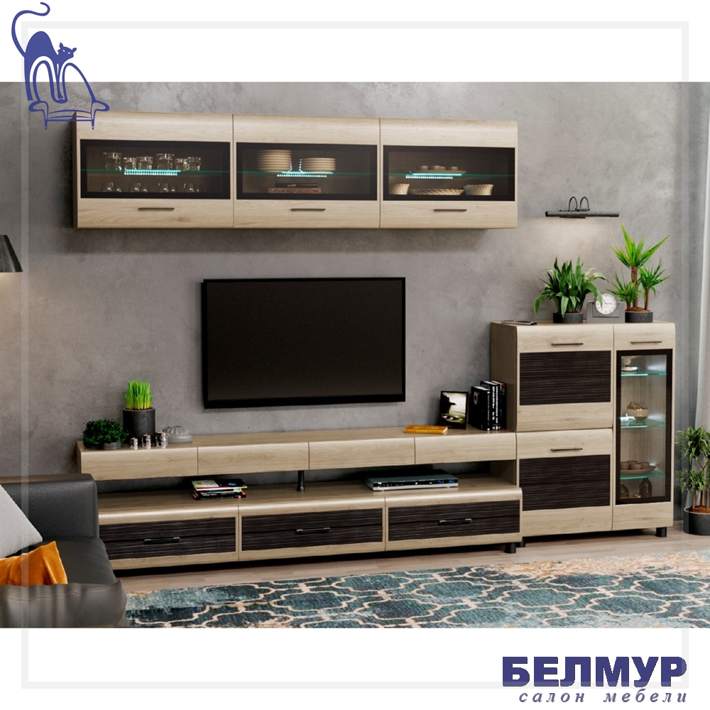 - В гостиной "Глейс" необычная открытая полка является как будто продолжением ручки - декора. Она имеет вид визуально объемного, толстостенного, цельнодеревянного бруса и при этом она необычайно легкая. Поэтому элементы мебели из тамбурата на всем протяжении срока эксплуатации мебель сохраняет идеальную форму и стильный вид.
