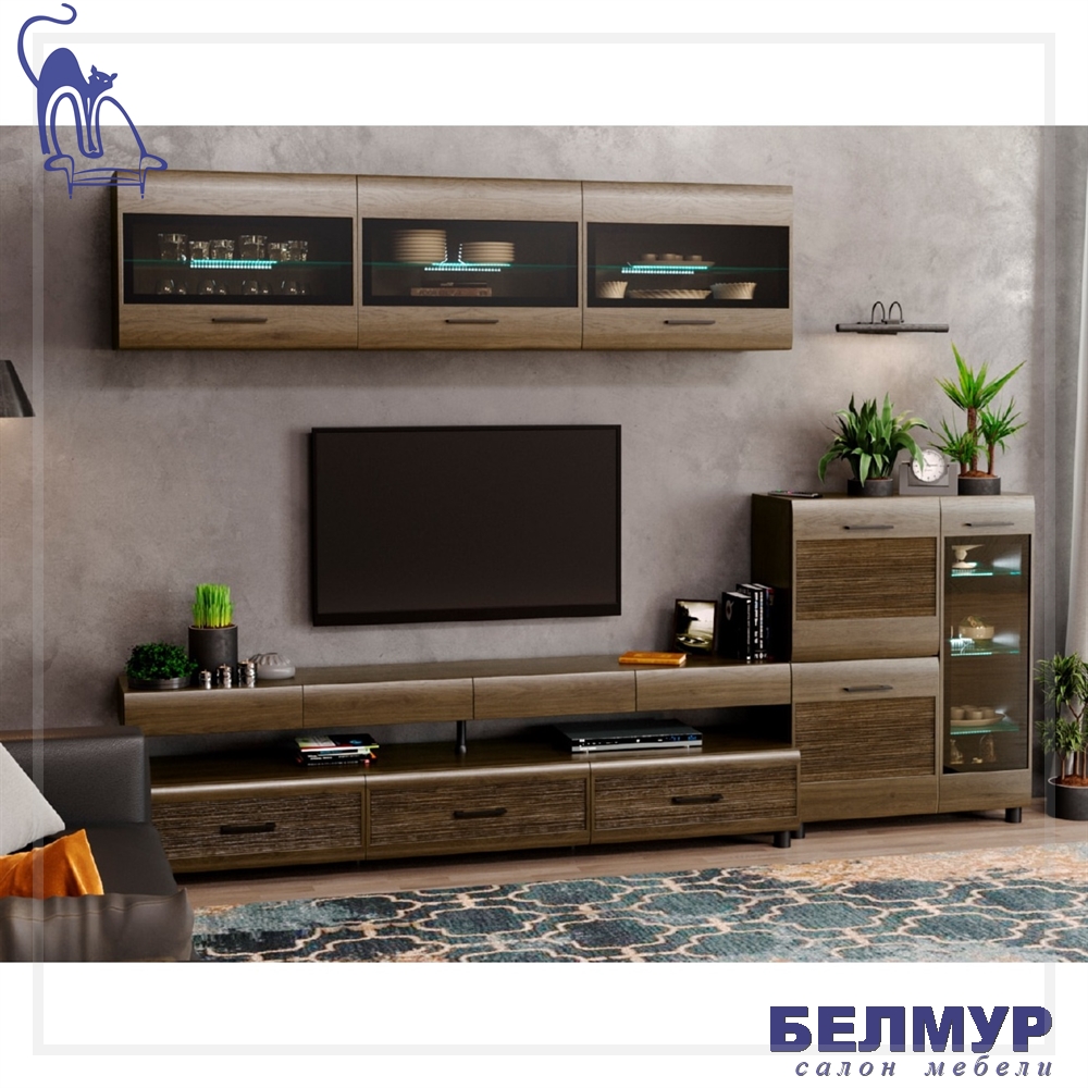 - В гостиной "Глейс" необычная открытая полка является как будто продолжением ручки - декора. Она имеет вид визуально объемного, толстостенного, цельнодеревянного бруса и при этом она необычайно легкая. Поэтому элементы мебели из тамбурата на всем протяжении срока эксплуатации мебель сохраняет идеальную форму и стильный вид.