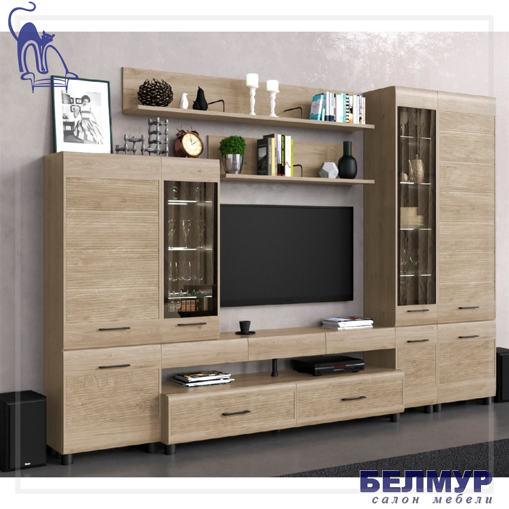 - В гостиной "Глейс" необычная открытая полка является как будто продолжением ручки - декора. Она имеет вид визуально объемного, толстостенного, цельнодеревянного бруса и при этом она необычайно легкая. Поэтому элементы мебели из тамбурата на всем протяжении срока эксплуатации мебель сохраняет идеальную форму и стильный вид.