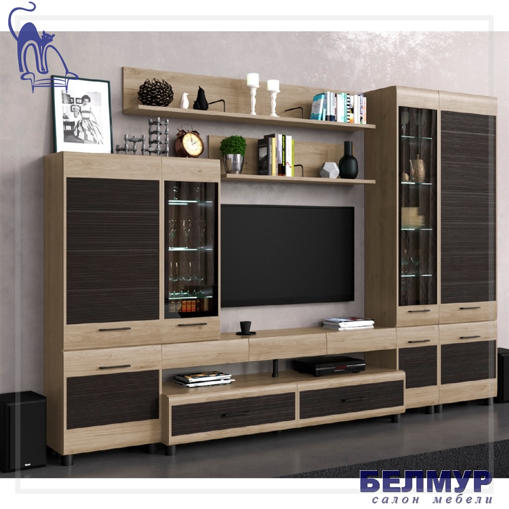 - В гостиной "Глейс" необычная открытая полка является как будто продолжением ручки - декора. Она имеет вид визуально объемного, толстостенного, цельнодеревянного бруса и при этом она необычайно легкая. Поэтому элементы мебели из тамбурата на всем протяжении срока эксплуатации мебель сохраняет идеальную форму и стильный вид.