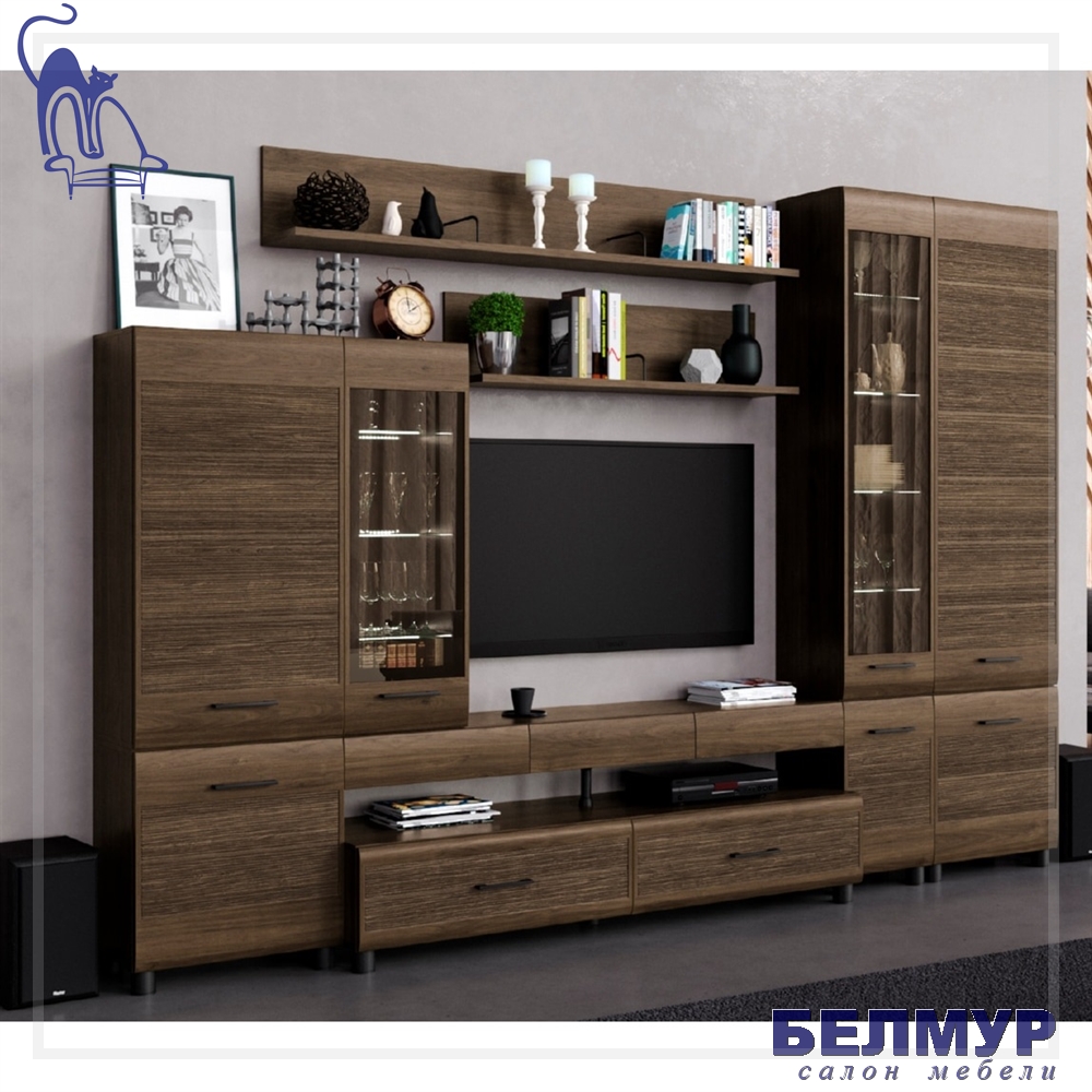 - В гостиной "Глейс" необычная открытая полка является как будто продолжением ручки - декора. Она имеет вид визуально объемного, толстостенного, цельнодеревянного бруса и при этом она необычайно легкая. Поэтому элементы мебели из тамбурата на всем протяжении срока эксплуатации мебель сохраняет идеальную форму и стильный вид.