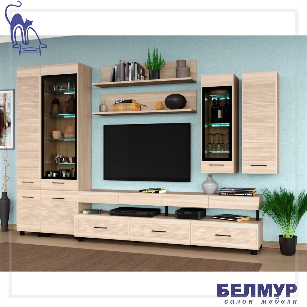 - В гостиной "Глейс" необычная открытая полка является как будто продолжением ручки - декора. Она имеет вид визуально объемного, толстостенного, цельнодеревянного бруса и при этом она необычайно легкая. Поэтому элементы мебели из тамбурата на всем протяжении срока эксплуатации мебель сохраняет идеальную форму и стильный вид.