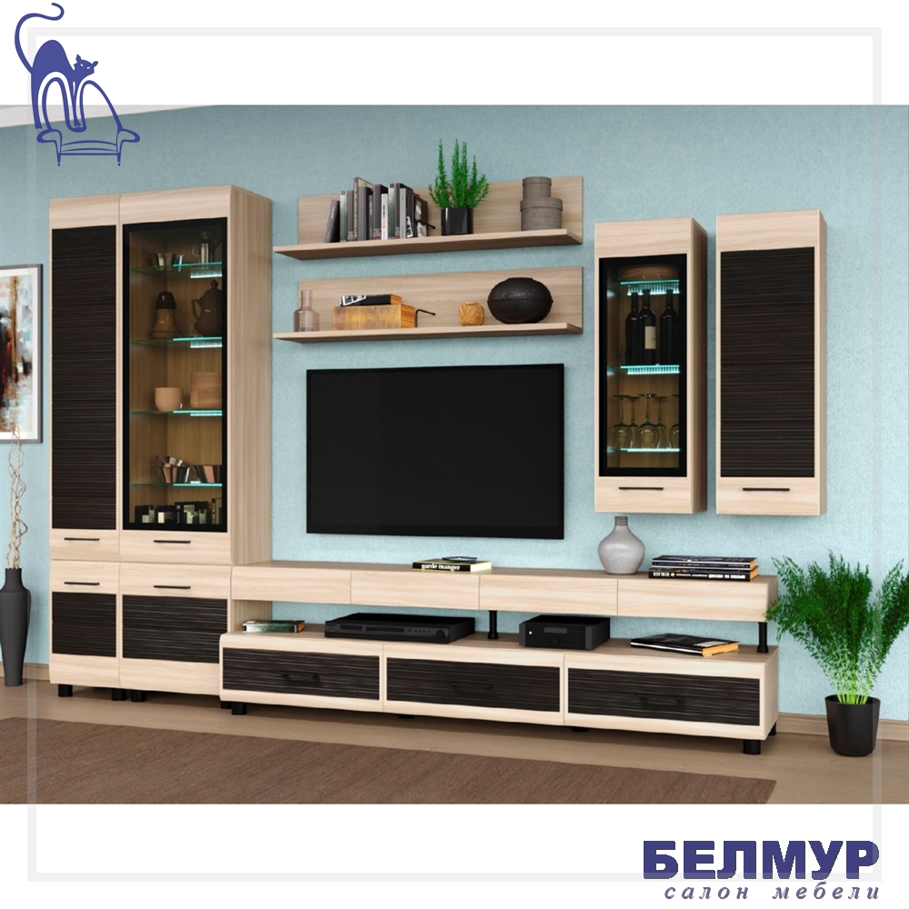 - В гостиной "Глейс" необычная открытая полка является как будто продолжением ручки - декора. Она имеет вид визуально объемного, толстостенного, цельнодеревянного бруса и при этом она необычайно легкая. Поэтому элементы мебели из тамбурата на всем протяжении срока эксплуатации мебель сохраняет идеальную форму и стильный вид.
