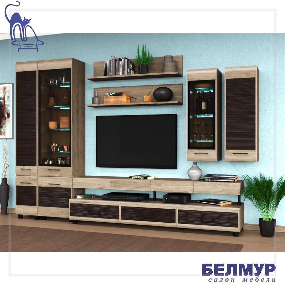 - В гостиной "Глейс" необычная открытая полка является как будто продолжением ручки - декора. Она имеет вид визуально объемного, толстостенного, цельнодеревянного бруса и при этом она необычайно легкая. Поэтому элементы мебели из тамбурата на всем протяжении срока эксплуатации мебель сохраняет идеальную форму и стильный вид.