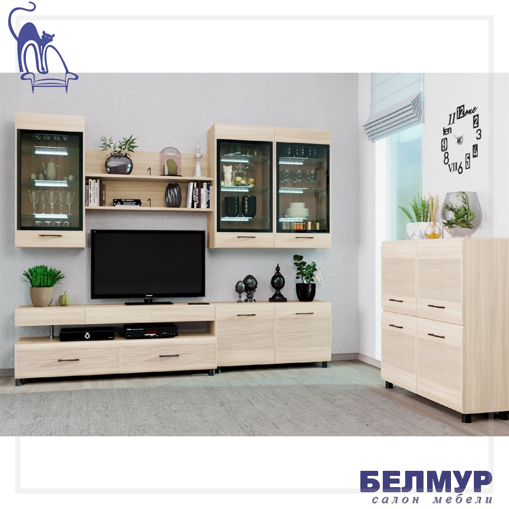 - В гостиной "Глейс" необычная открытая полка является как будто продолжением ручки - декора. Она имеет вид визуально объемного, толстостенного, цельнодеревянного бруса и при этом она необычайно легкая. Поэтому элементы мебели из тамбурата на всем протяжении срока эксплуатации мебель сохраняет идеальную форму и стильный вид.