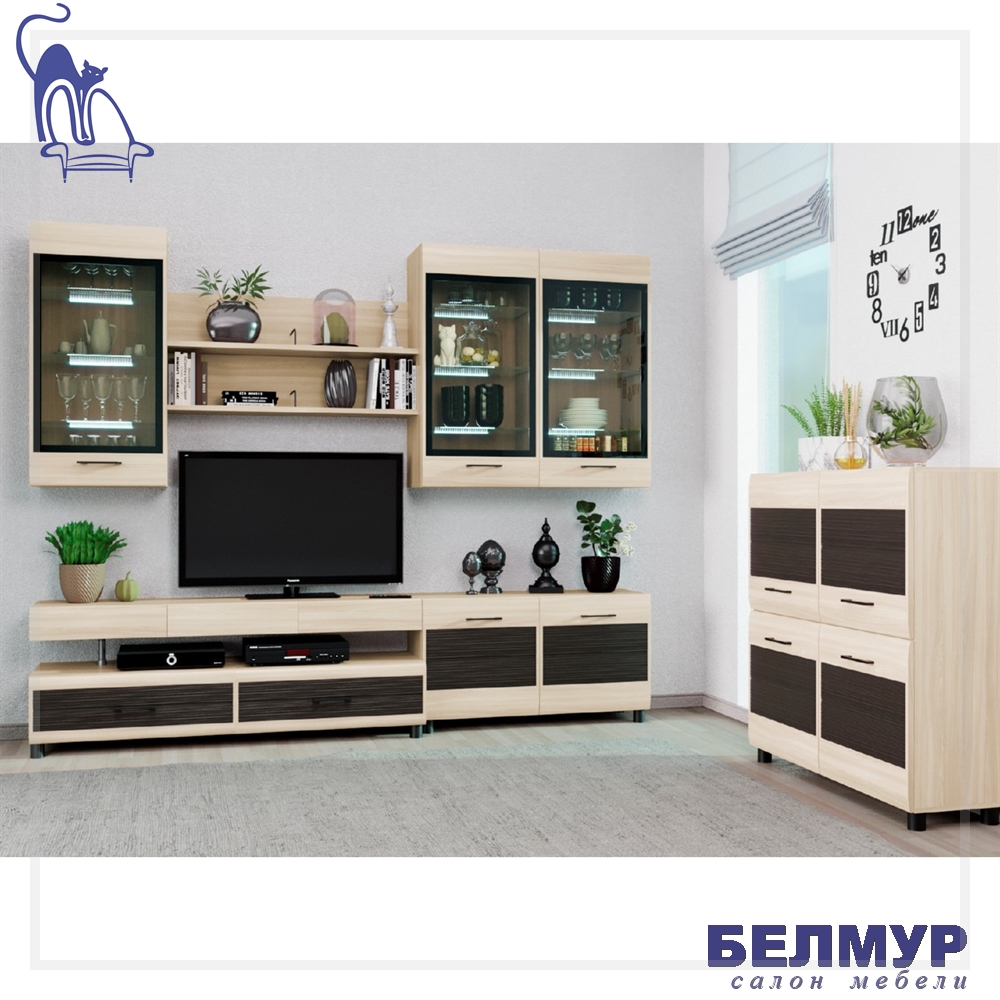 - В гостиной "Глейс" необычная открытая полка является как будто продолжением ручки - декора. Она имеет вид визуально объемного, толстостенного, цельнодеревянного бруса и при этом она необычайно легкая. Поэтому элементы мебели из тамбурата на всем протяжении срока эксплуатации мебель сохраняет идеальную форму и стильный вид.