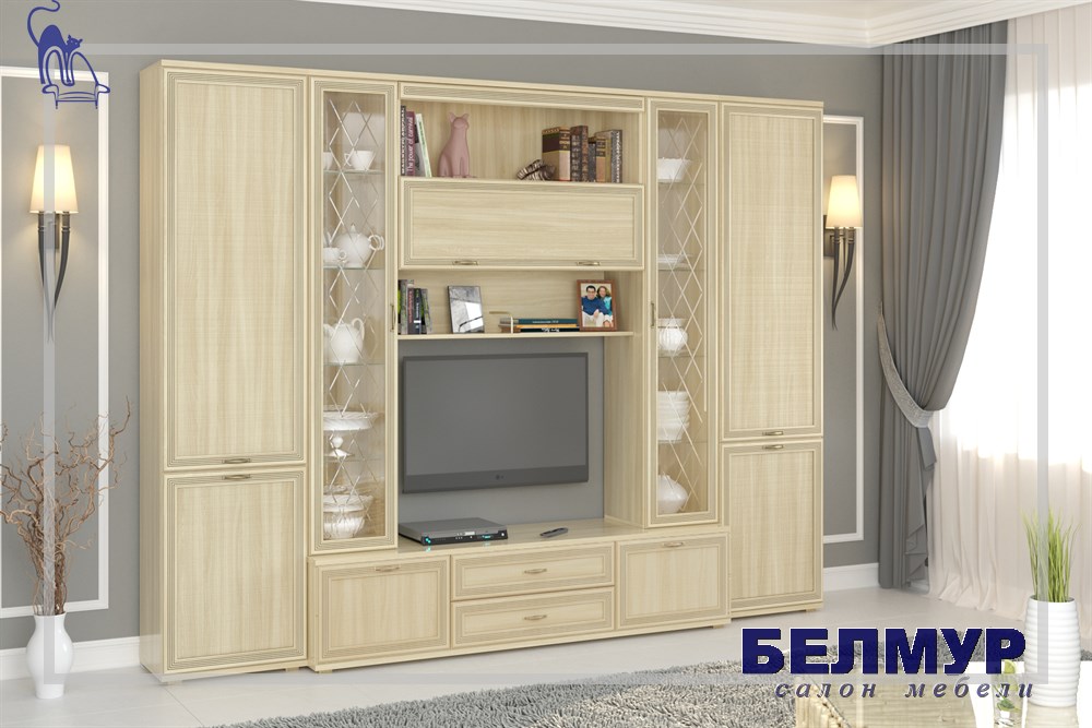 Модульная система поможет создать в помещении комфортную и уютную атмосферу, и будет способствовать рациональному использованию пространства. Мебель оснащена выдвижными ящиками, открытыми и закрытыми полками, вместительными нишами для хранения бытовых мелочей и личных вещей. Гостиная изготовлена из экологически чистых материалов, отличается функциональностью и практичностью. Потребители смогут приобрести данную модель по доступной стоимости.