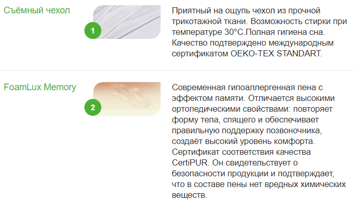 | Ткань чехла | Приятный на ощупь чехол из прочной трикотажной ткани. Возможность стирки при температуре 30°С.Полная гигиена сна. Качество подтверждено международным сертификатом OEKO-TEX STANDART. |