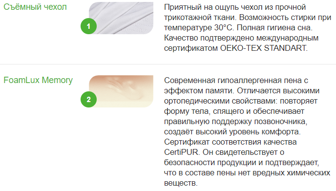 | Ткань чехла | Приятный на ощупь чехол из прочной трикотажной ткани. Возможность стирки при температуре 30°С. Полная гигиена сна. Качество подтверждено международным сертификатом OEKO-TEX STANDART. |
