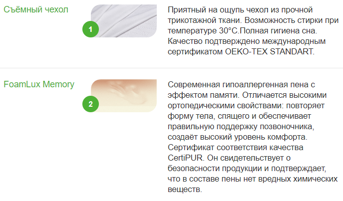 | Ткань чехла | Приятный на ощупь чехол из прочной трикотажной ткани. Возможность стирки при t= до 30 гр. Полная гигиена сна. Качество подтверждено международным сертификатом OEKO-TEX STANDART |