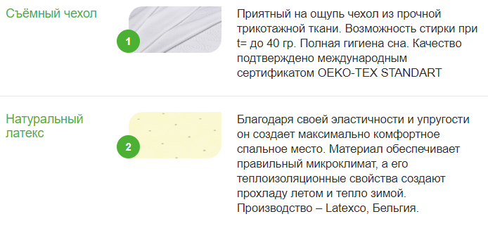 | Ткань чехла | Приятный на ощупь чехол из прочной трикотажной ткани. Возможность стирки при t= до 30 гр. Полная гигиена сна. Качество подтверждено международным сертификатом OEKO-TEX STANDART |