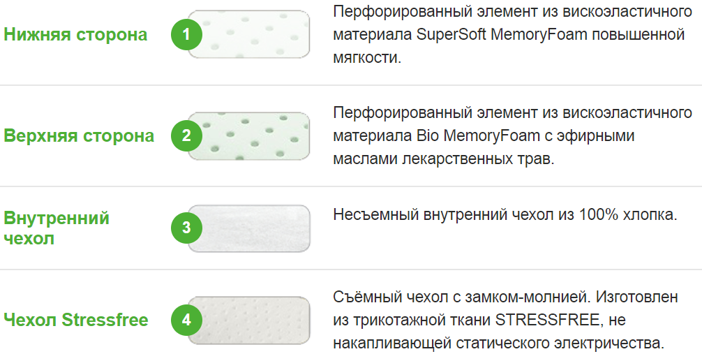 | Наполнение | Перфорированный элемент из вsскоэластичного материала MemoryFoam повышенной мягкости с одной стороны и обычный MemoryFoam с другой стороны |
