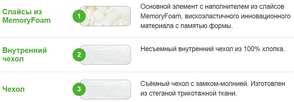 | Ткань чехла | памятиВнешний чехол- Съёмный с замком-молнией. Изготовлен из трикотажной ткани.Внутренний чехол- Несъемный из 100% хлопка. |