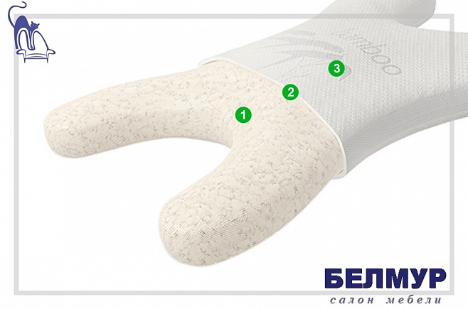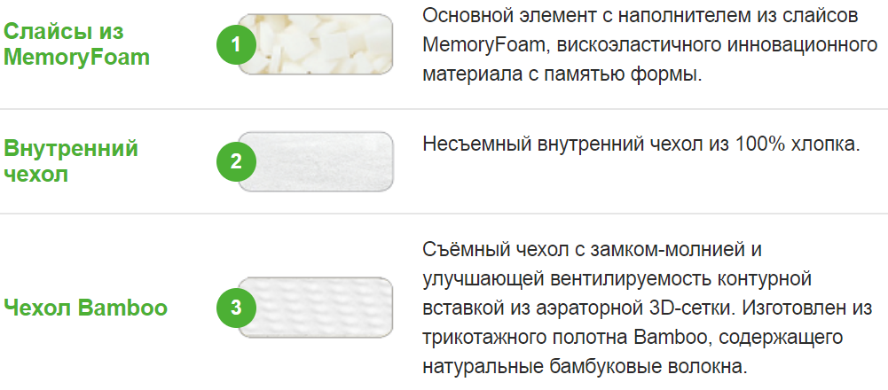 | Ткань чехла | Внешний чехол- Съёмный чехол с замком-молнией и улучшающей вентилируемость контурной вставкой из аэраторной 3D-сетки. Изготовлен из трикотажного полотна Bamboo, содержащего натуральные бамбуковые волокна.Внутренний чехол- Несъемный из 100% хлопка. |