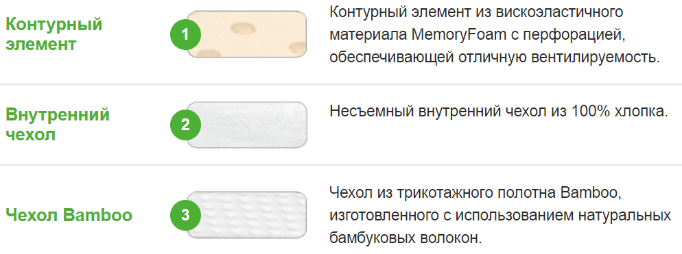 | Ткань чехла | Внешний чехол- из трикотажного полотна Bamboo, изготовленного с использованием натуральных бамбуковых волоконВнутренний чехол- Несъемный из 100% хлопка. |