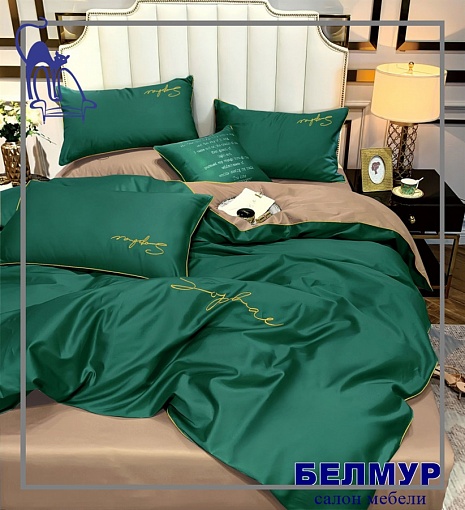 КПБ Winni Simplicity с простыней на резинке /размер ЕВРО/ однотонный с вышивкой зеленый/персик
