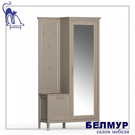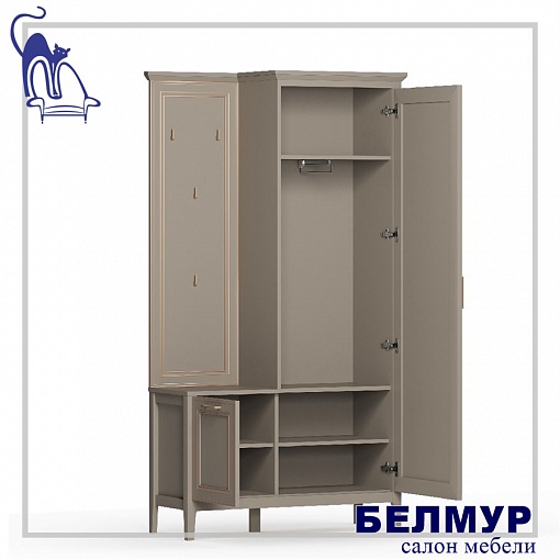 - в левой части — отделение для хранения за глухой распашной дверцей и щит с крючками для навешивания одежды