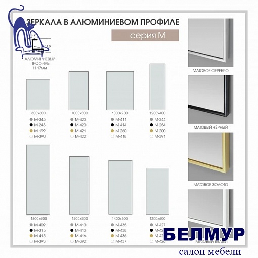 | Рама | алюминий крашеный, цвет - золотой матовый, ширина торца 17мм. |